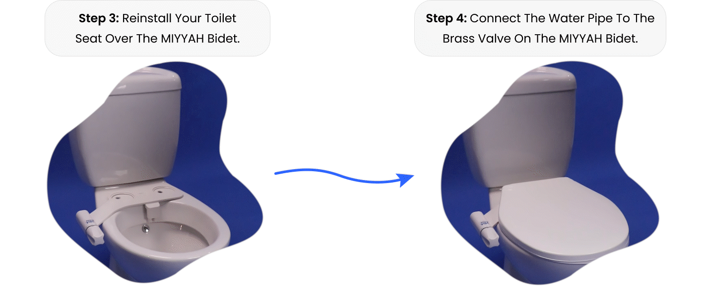 Shut off your water supply and flush your toilet. Remove your toilet seat and do a deep clean. Attach the bidet to your water supply and toilet using the connections supplied. Reinstall your toilet seat. Here's a guide as-well.